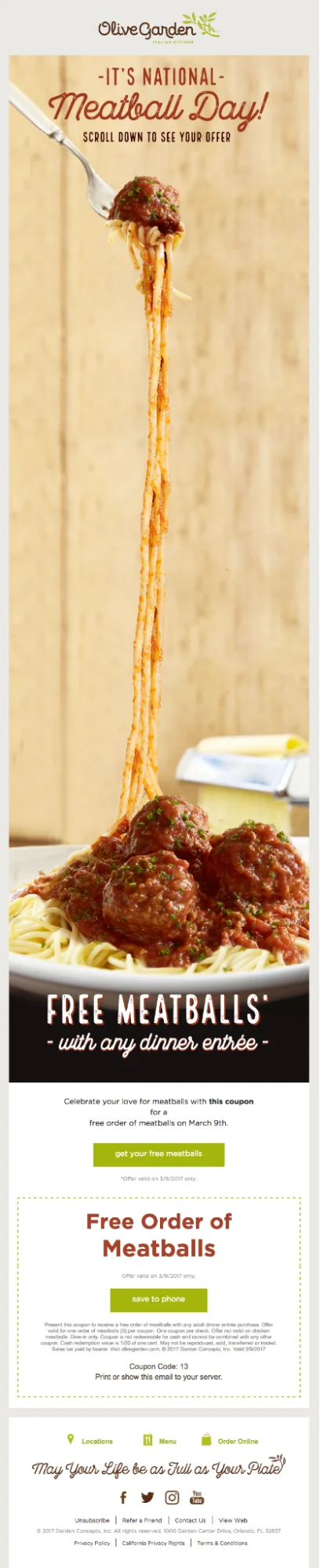 Olive Garden uses creative imagery (easily created now with AI) to draw attention to a special offer and make it feel exciting to forward.